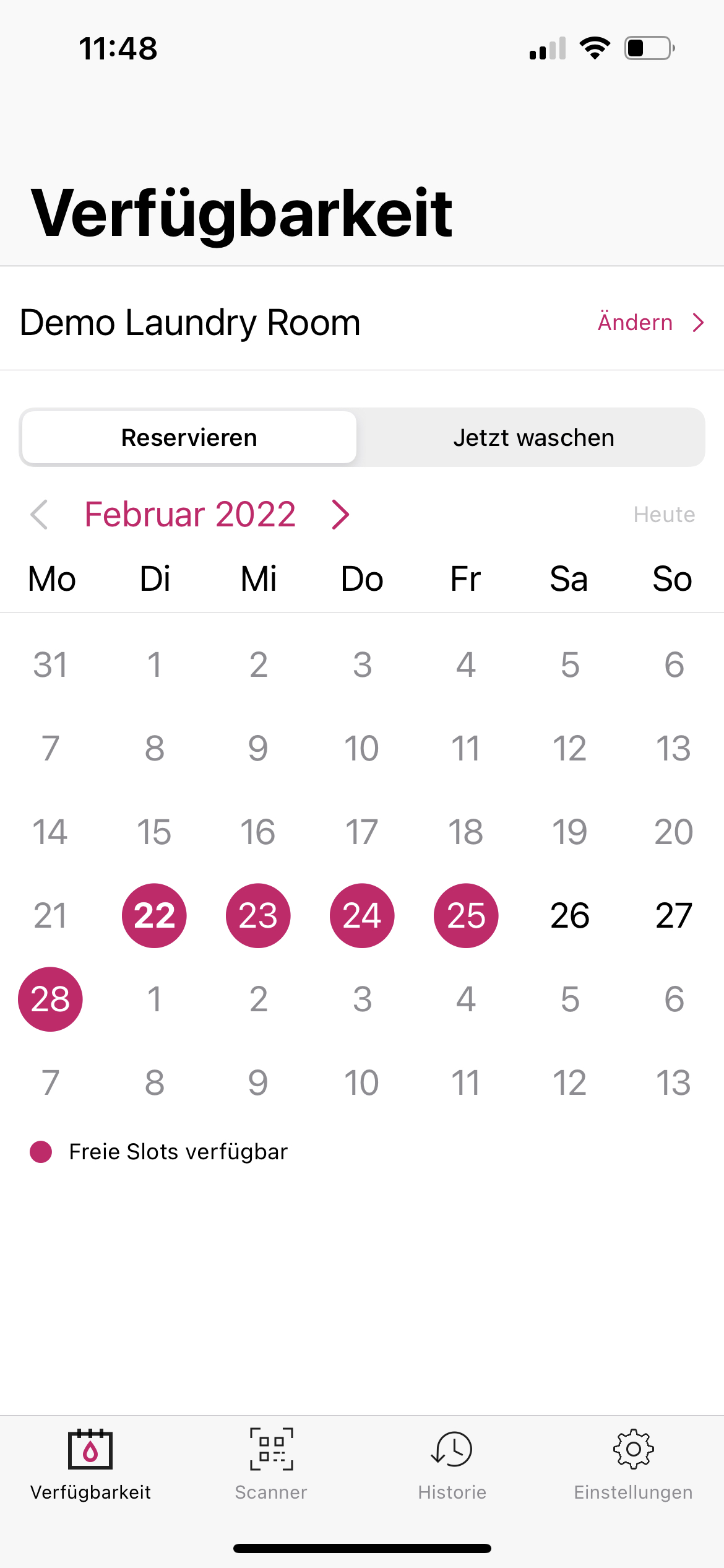 Wenn die Funktion «📅 Kalender » von Ihrem Betreiber freigeschaltet ist, sehen Sie diese unter « Verfügbarkeit ». Dort sehen Sie, an welchen Tagen Maschinen verfügbar sind. Klicken Sie auf das freie Wunschdatum und reservieren Sie ein passendes Zeitfenster.
