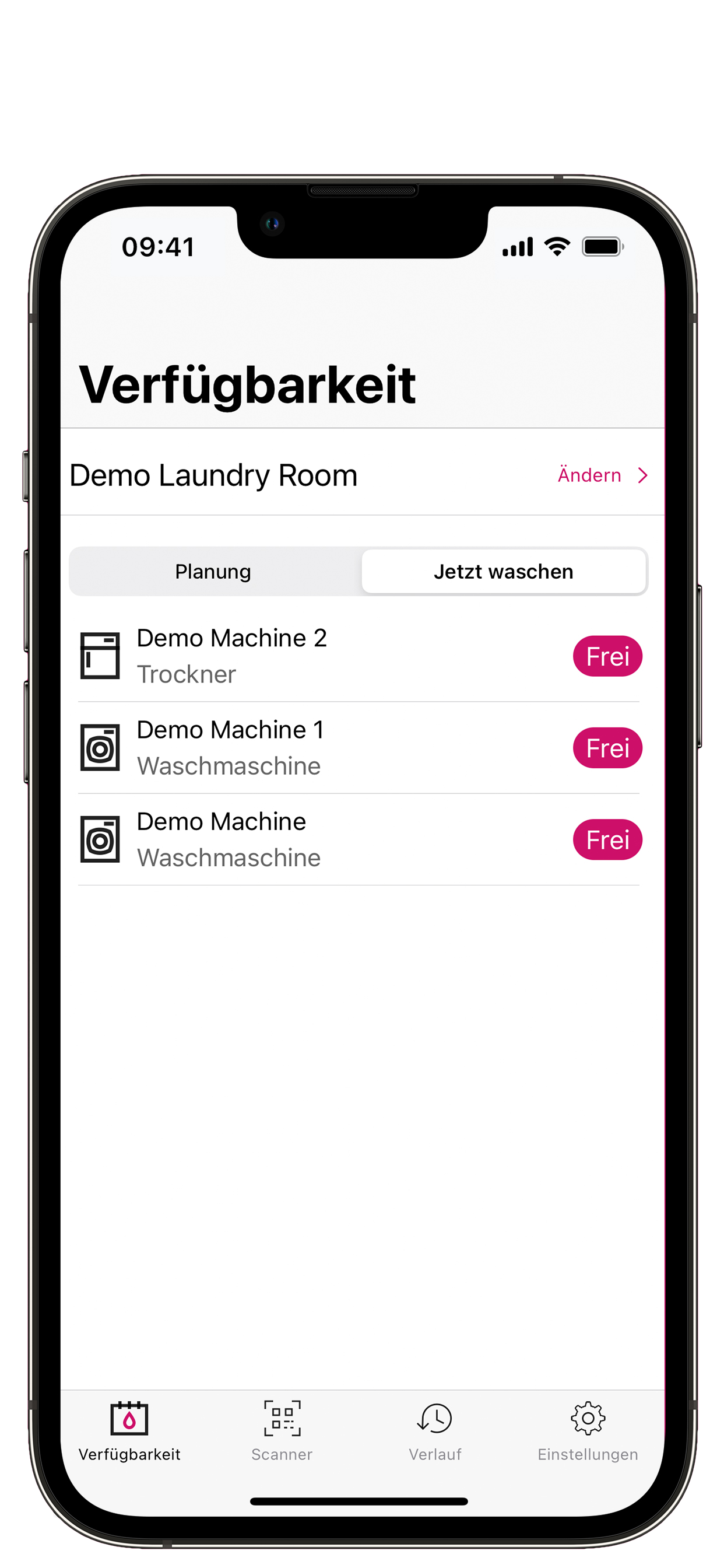 Unter « Jetzt waschen » werden die jetzt verfügbaren Maschinen angezeigt, damit Sie wissen, welche in diesem Moment zum Waschen oder Trocknen frei sind.