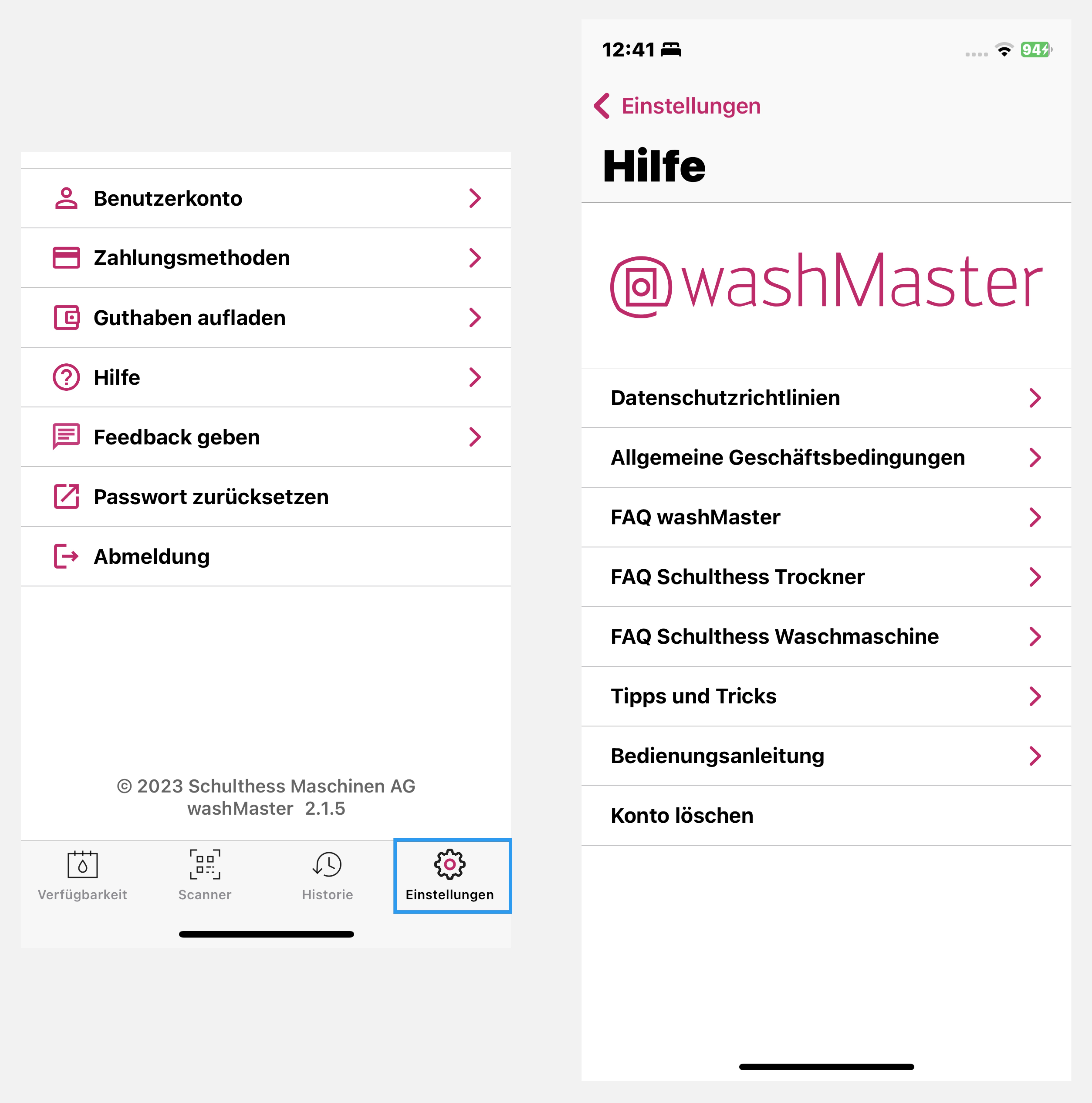 - Unter «❓ Hilfe » finden Sie hilfreiche Links, z. B. zu häufig gestellten Fragen. Unter dieser Kategorie können Sie auch Ihr washMaster-Konto löschen lassen, falls Sie es nicht mehr benötigen.
