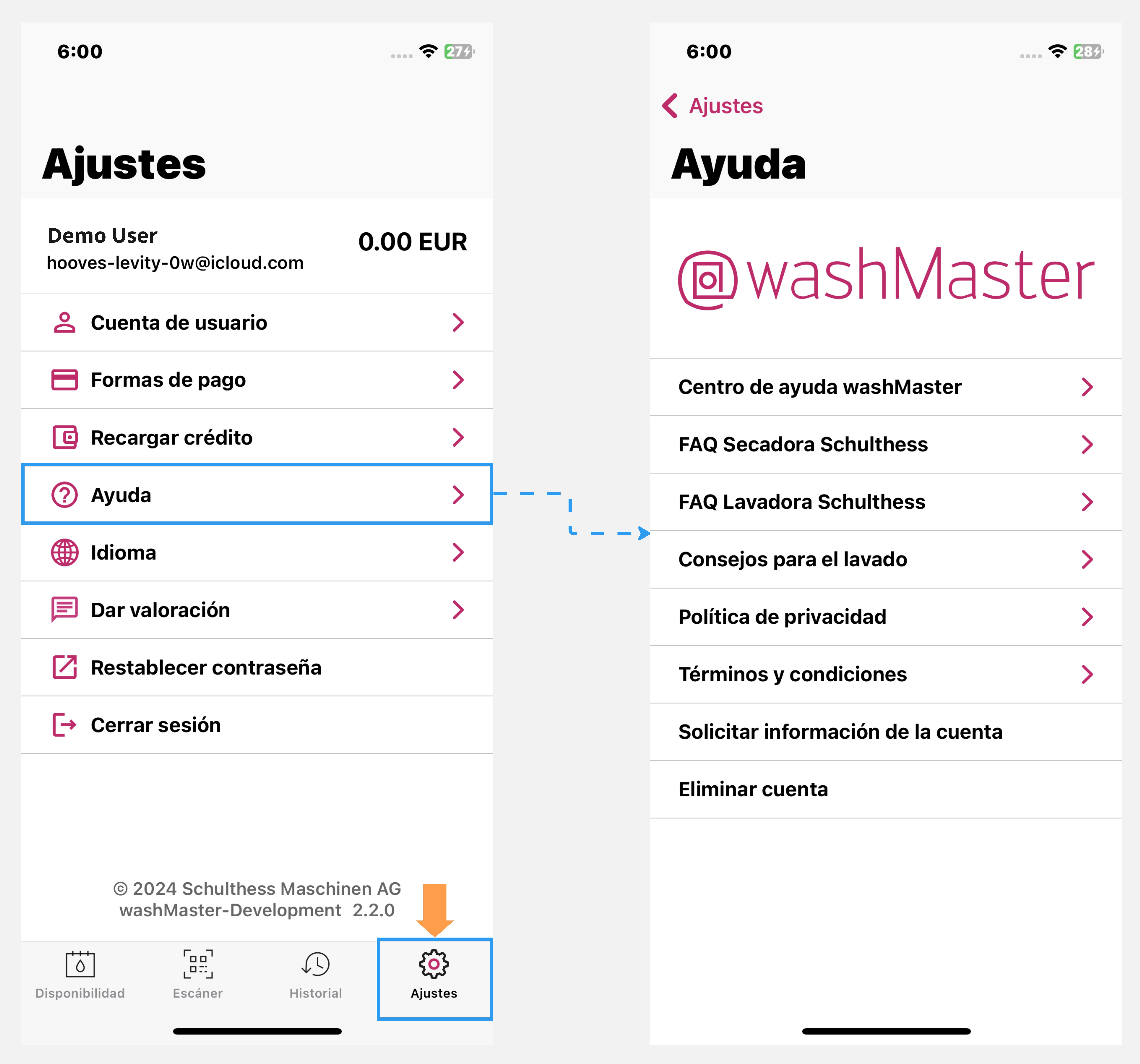 - En «❓ Ayuda », encontrará enlaces útiles, por ejemplo, a las preguntas más frecuentes. En esta categoría, también puede eliminar su cuenta washMaster si ya no la necesita.