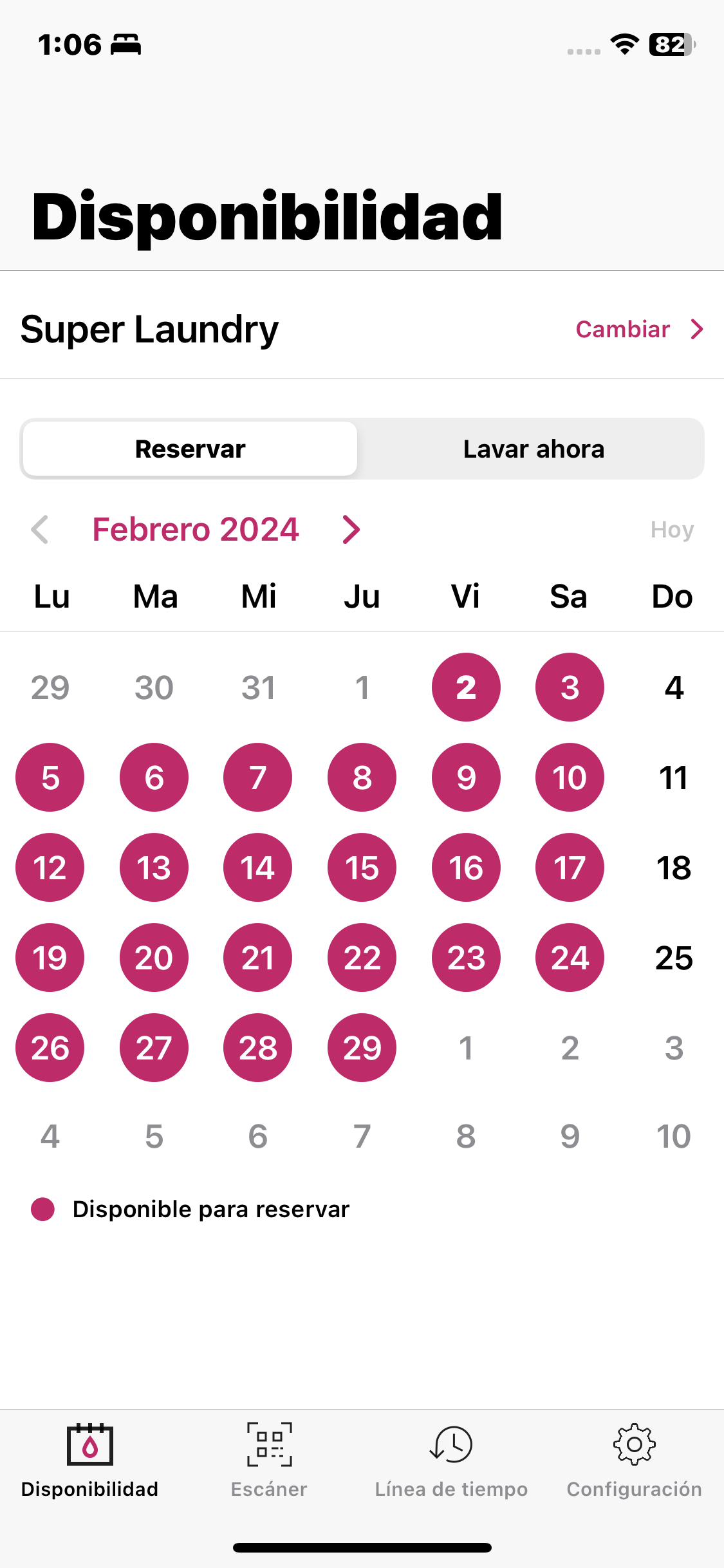 Cuando la función «📅 Calendario » sea activada por su operador, podrá reservar una máquina en la opcion « Disponibilidad ». Allí verá en qué días hay franjas horarias disponibles. Haga clic en la fecha disponible que desee y reserve un horario adecuado.