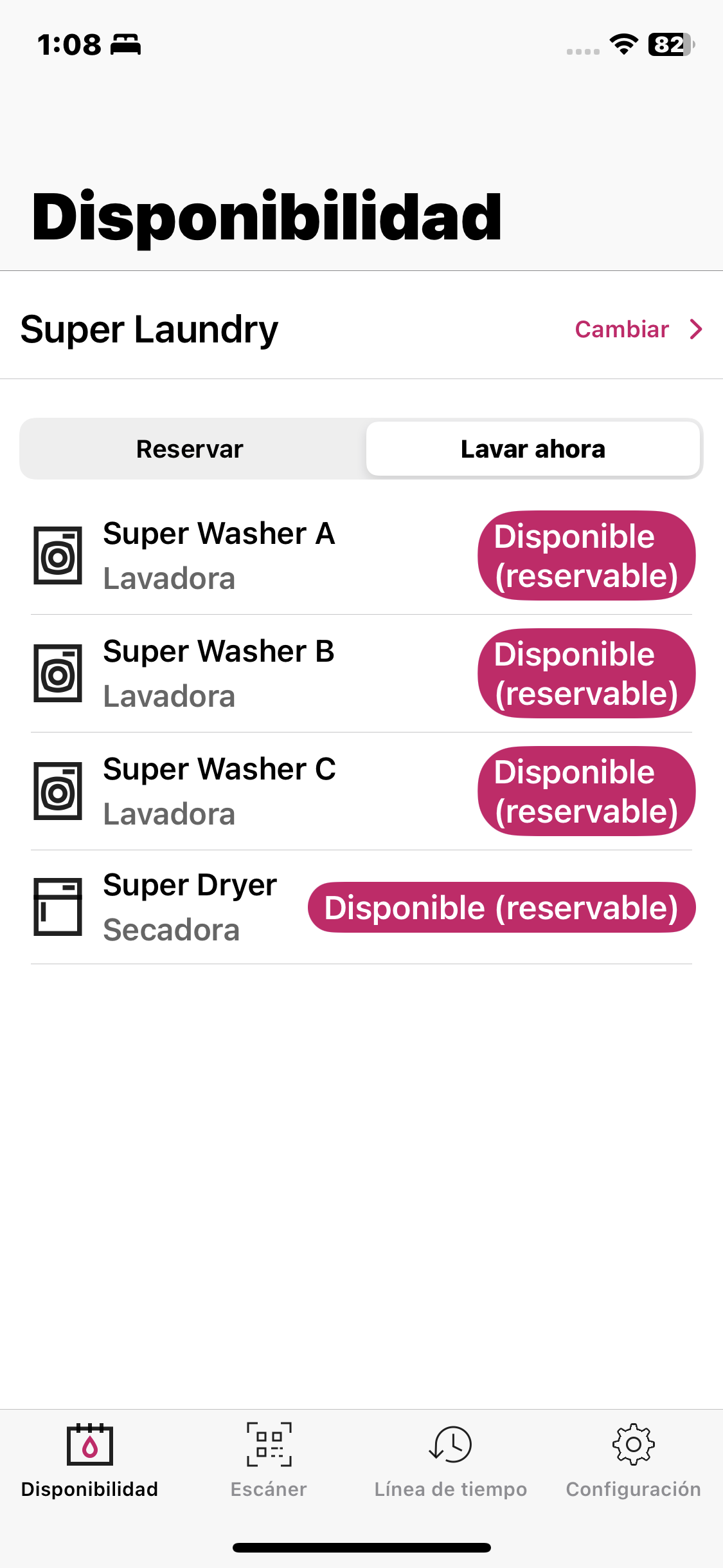En « Lavar ahora », se muestran las máquinas que están disponibles en este momento, lo que le permite ver fácilmente cuáles máquinas están actualmente disponibles para lavar o secar.