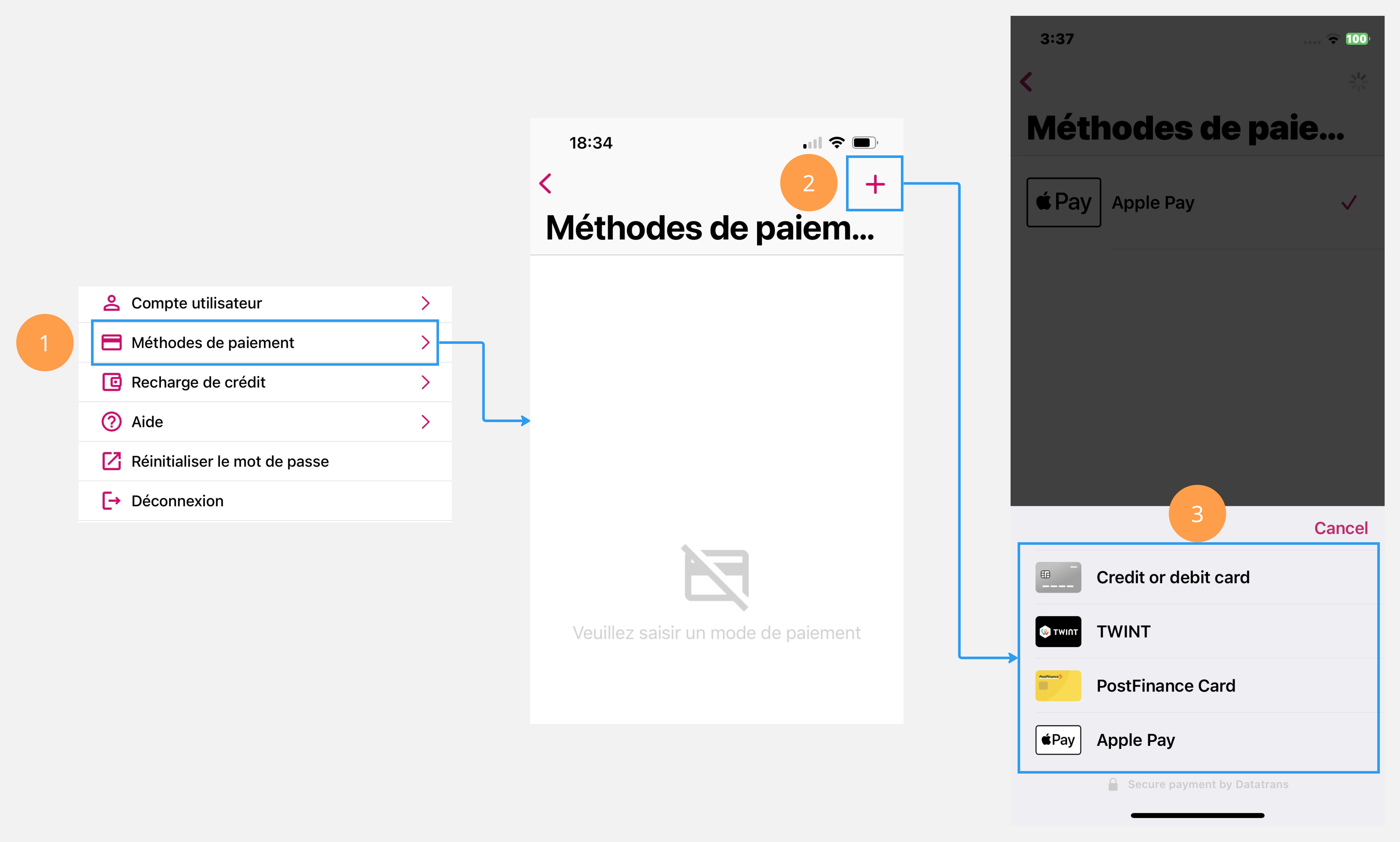 💳 Ajouter une méthode de paiement Sous «⚙️ Paramètres», vous pouvez ajouter un ou plusieurs modes de paiement sous «💳 Méthodes de paiement». Cliquez sur le signe "➕" en haut à droite et sélectionnez ensuite l’un des méthodes de paiement disponibles.