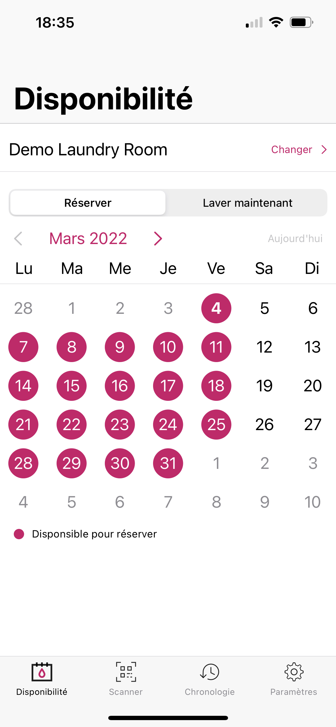 Si la fonction «📅 Calendrier » a été activée par votre exploitant, vous pouvez réserver une machine sous « Disponibilité ». Vous verrez quels créneaux sont encore disponibles et à quels jours. Cliquez sur la date disponible souhaitée et réservez le créneau horaire de votre choix.