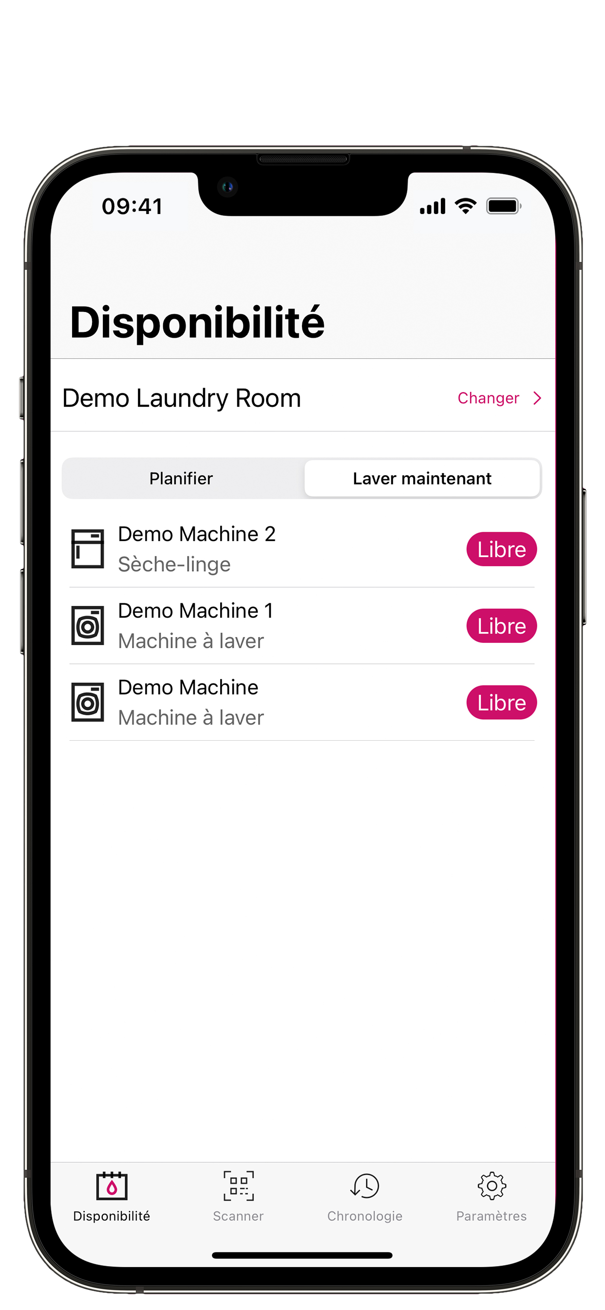 L’onglet « Laver maintenant » indique les machines actuellement disponibles et vous signale celles qui sont libres en ce moment pour le lavage et le séchage.