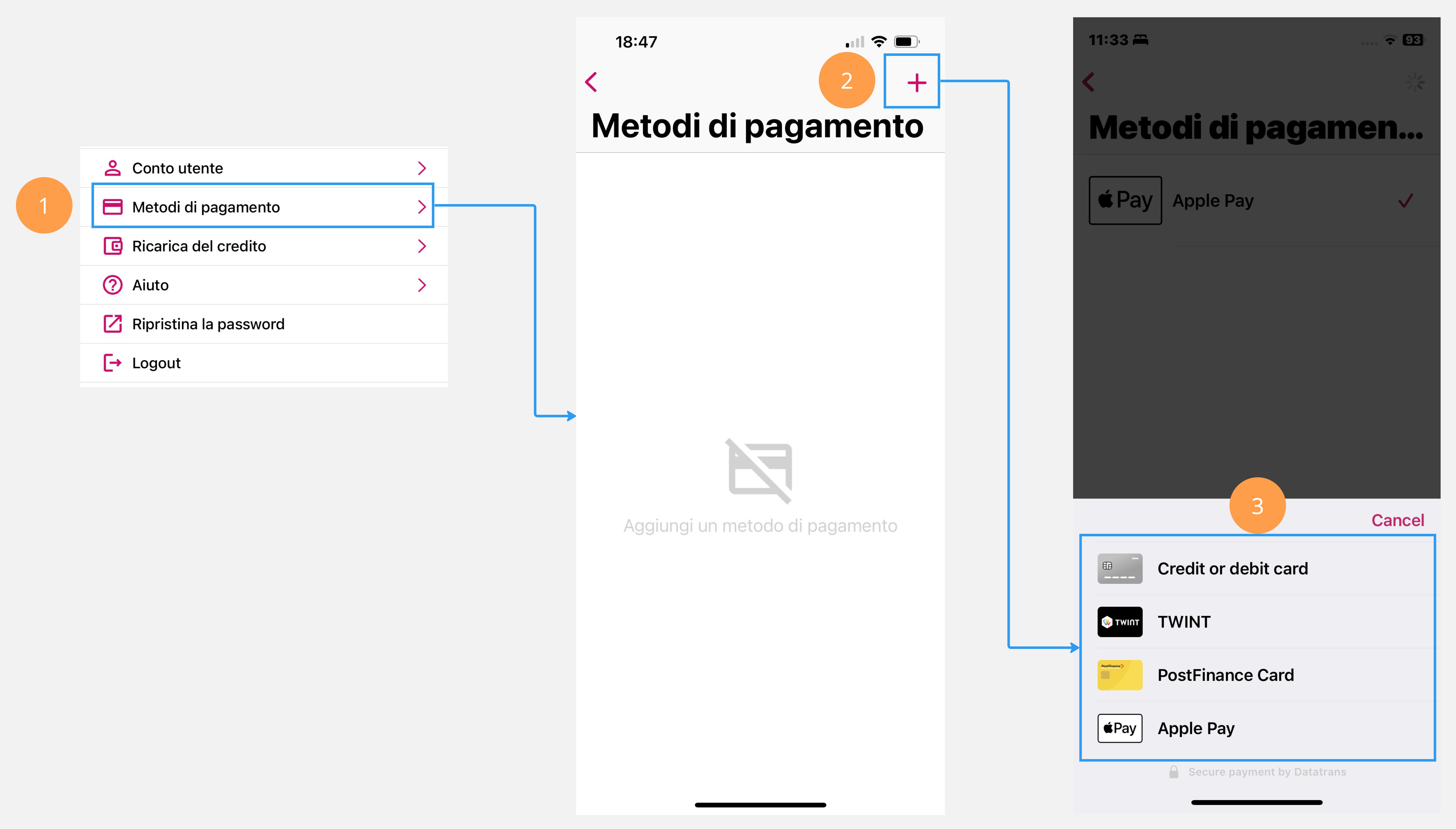 💳 Aggiungere un metodo di pagamento Nelle «⚙️ Impostazioni» è possibile memorizzare uno o più Metodi di pagamento «💳 Metodi di pagamento». Cliccate sul simbolo "➕" in alto a destra e selezionate una forma di pagamento disponibile.