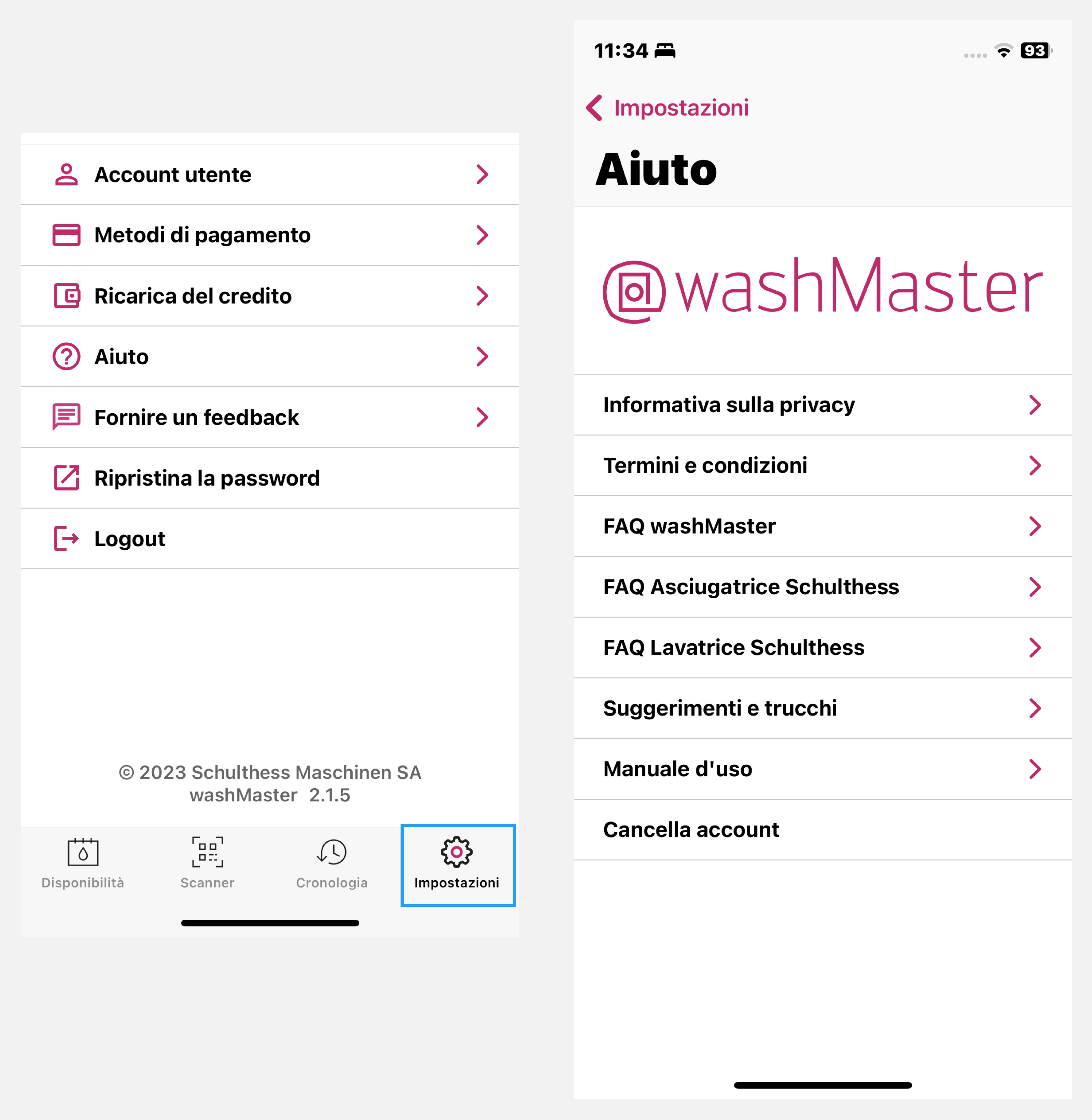 - Alla voce «❓ Aiuto » trovate utili link, ad esempio le FAQ. In questa categoria potete anche eliminare il vostro account washMaster, nel caso non vi serva più.