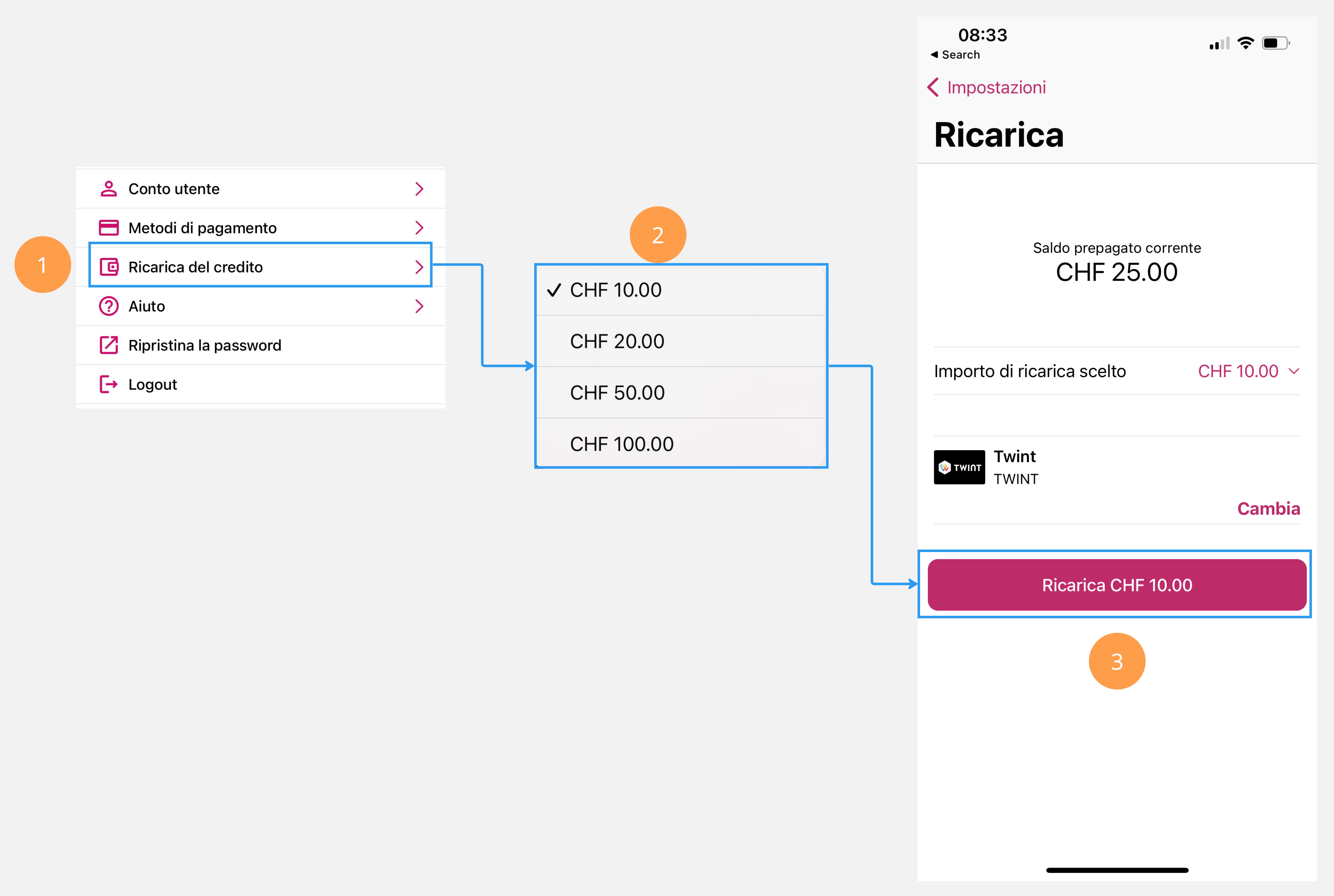 Se il gestore non offre il pagamento diretto, vi preghiamo di caricare un credito prepagato nell’app washMaster, in modo da poter poi pagare i vostri cicli di lavaggio con l’applicazione. Per farlo, andate su «⚙️ Impostazioni », quindi selezionate «💸 Ricarica credito ». Selezionate ora uno degli importi visualizzati e confermatelo con «💳 Ricarica ».