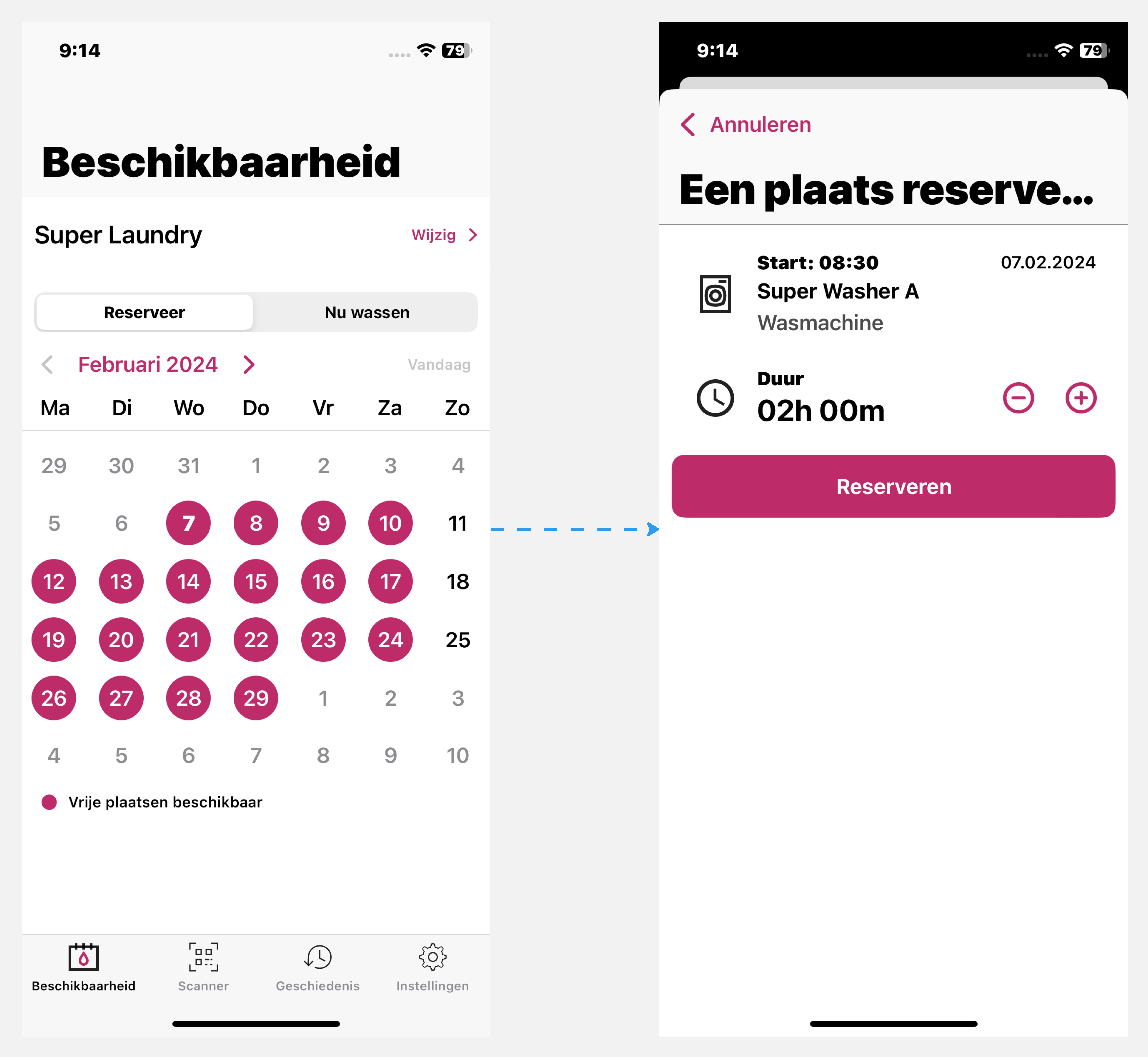 - Uw reservering: de machine is voor u gereserveerd.